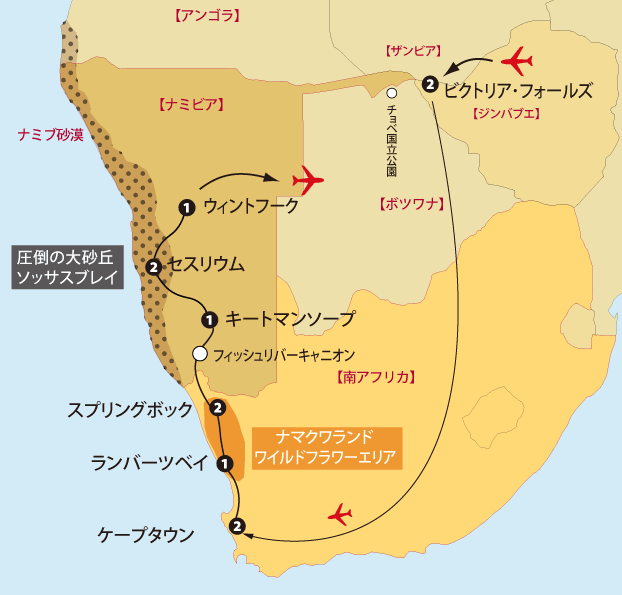南から北へ、効率的な行程で南アフリカ共和国、ナミビア、ジンバブエ、ザンビア、ボツワナの5カ国の魅力にご案内!