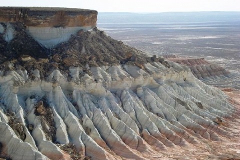 ヤンギカラ渓谷 カスピ海の海底が隆起と風化、そして浸食を繰り返して出来た渓谷。赤やピンクと白い色の縞模様の台地が果てしなく連なって広がる絶景の中を四輪駆動車で走ります。