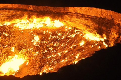 カラコルム砂漠のガス・クレーター「地獄の門」 トルクメン語で「黒い砂」の意のカラクム砂漠は35万平方キロの面積を持ち国土の70%を占める大砂漠です。中央部には旧ソビエト時代に探査が行われ途中放棄されたガス田が今も消化不可能で炎を上げ続けており「地獄の門」と呼ばれていますが、近年環境保全の為、徐々に消火作業が始まっており、以前比べると炎の量は若干減少しています。
