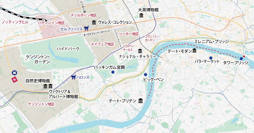 ロンドン滞在 ■終日、ロンドン在住日本人ガイドと公共交通機関でロンドン市内観光。ホテル周辺の案内や地下鉄の乗り方の案内の後、テムズ川左岸・右岸の散策にご案内します。ビッグ・ベンなどのウェストミンスター地区◯、タワーブリッジ◯、ロンドン子の台所・バラ・マーケット◯、近・現代芸術の殿堂・テート・モダン◎など。