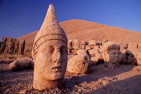 コンマゲネ王国・山上の聖域 ネムルート山 コンマゲネ王国の王アンティオコス 1 世が築いた墳墓として知られるネムルート山(標高 2,150m)は、前1世紀に栄えた王国が残した壮大なモニュメントで、東西の巨像群を従えた独特の景観で知られる世界遺産です。観光は未明に山麓を出発し、車で移動後、徒歩約 30 分で頂上へ。やがて夜明け前の静けさの中、巨像群が薄明に浮かび上がり、日の出とともに柔らかな光を受けて表情を変えていく様子は印象的です。山頂では王墓とされる円錐形の墳墓、東西テラスの神像群、レリーフなどを見学します。王権観や宗教観が反映された遺構に触れ、古代への想いが広がります。