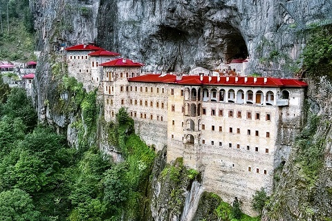 黒海沿岸の町トラブゾンと断崖に建つスメラ修道院 黒海沿岸の港町トラブゾンは、古くから東西交易の要衝として栄え、中世にはビザンツ文化の拠点となりました。近郊の渓谷に築かれたスメラ修道院は、断崖の中腹に寄り添うように建つ天空の修道院で、ビザンツ期の壁画を今に伝えます。黒海地方ならではの歴史と自然の対比が魅力です。