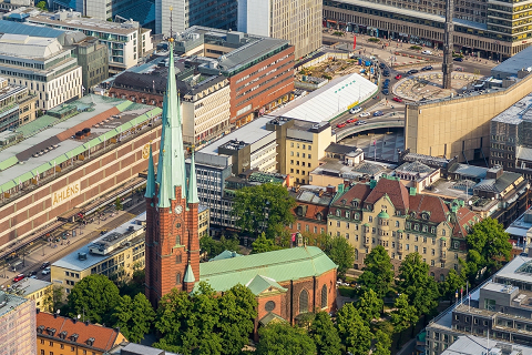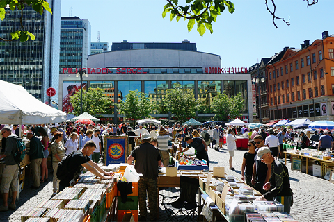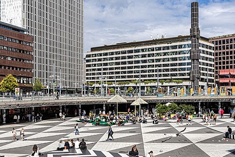 ヒョートリエット広場 から セルゲル広場へ ストックホルムのモダンな中心部を象徴する、ヒョートリエット広場(Hötorget)からセルゲル広場(Sergels torg)にかけてのエリアは、ショッピングやグルメ、そして現代建築が楽しめる非常に活気のある場所です。ヒョートリエット広場は日中は新鮮な果物、野菜、花々を売る屋台が並びます。地下にはスウェーデンの新鮮な食材から世界各国のデリなどが並ぶ屋内市場が。ドロットニングガータンと謂われる全長1kmを超える歩行者天国の一部(400m)を歩き、白と黒の市松模様が特徴的なセルゲル広場へ。ストックホルムの中心の中心となり、ガラスの柱は夜になるとライトアップされます。