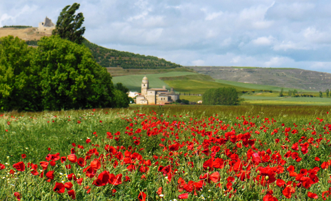 ❖ 5~6月は野花が咲く季節。画像は巡礼路・カストロヘリス周辺にて巡礼路の道端に咲くヒナゲシ(アマポーラ)。青い麦の穂や黄色い菜の花などと共に咲き乱れる光景は、巡礼路のハイライトの一つです。
